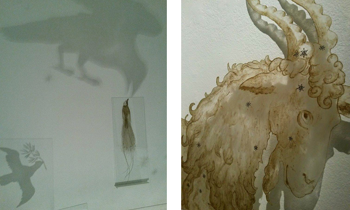 Valot ja varjot piirtävät gallerian seinille kosmisen draaman. Haukka hyökkää kohti tähdin koristeltua, pakenevaa joustenparvea. Seinän toisella laidalla on käynnissä jotain lempeämpää. Korppi ojentaa nokkansa kohti kaunispyrstöistä toveriaan – hetken näyttää siltä kuin linnut kohtaisivat toisensa sopuisasti. Aivan varmasti en osaa kuitenkaan sanoa.